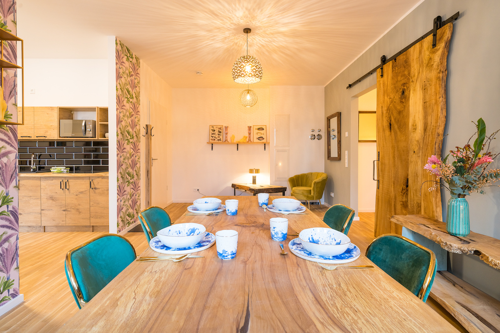 Dieses lichtdurchflutete Apartment, mit viel Liebe zum Detail und modernen Designstücken eingerichtet, verbindet Stil und Komfort. Eine voll ausgestattete Küche mit elegantem Geschirr, ein gemütlicher Essbereich, großzügige Schlafbereiche und feine Ausstattungsdetails schaffen eine einladende Atmosphäre.