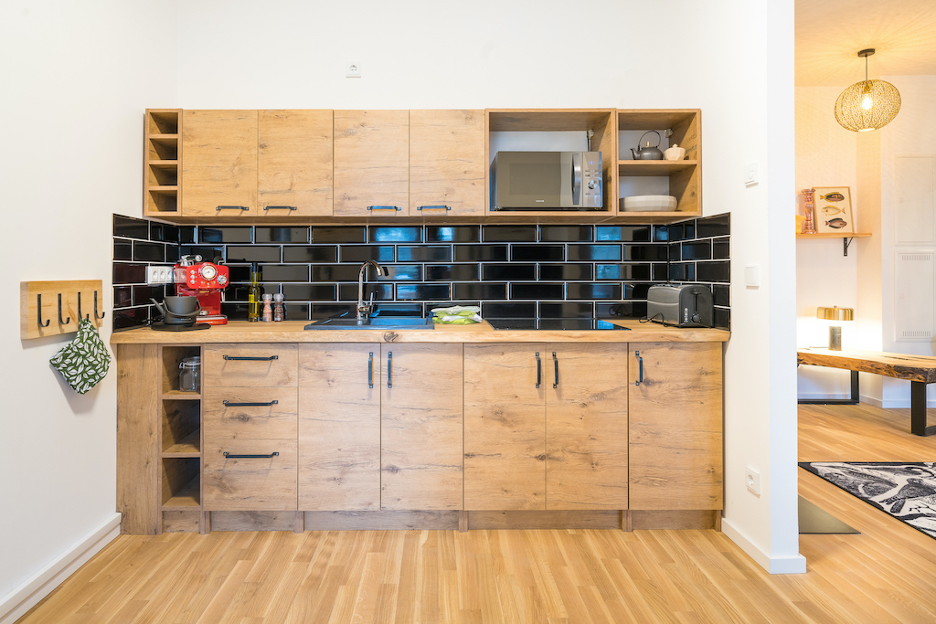 Bügeleisen, Kleiderbügel, Fön, Shampoo, Küche, Kaffeemaschine, Arbeitsplatz